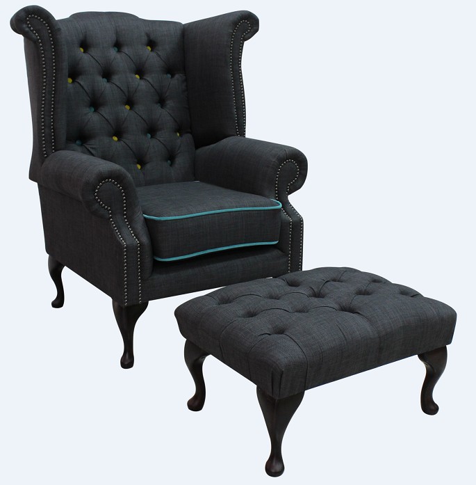 Chesterfield Linen Queen Anne High Back Wing Chair Charles Charcoal Blue Trim Footstool