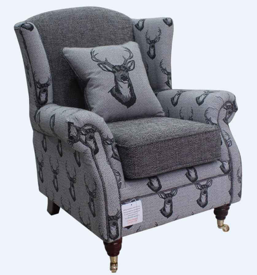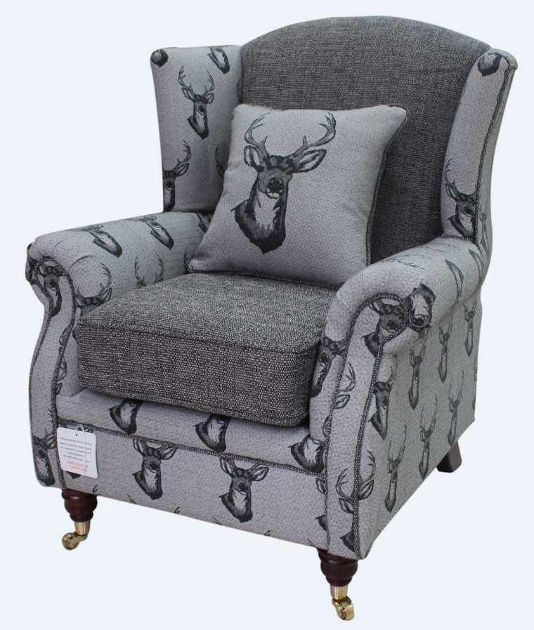 Wing Chair Fireside High Back Armchair Antler Stag Charcoal Grey